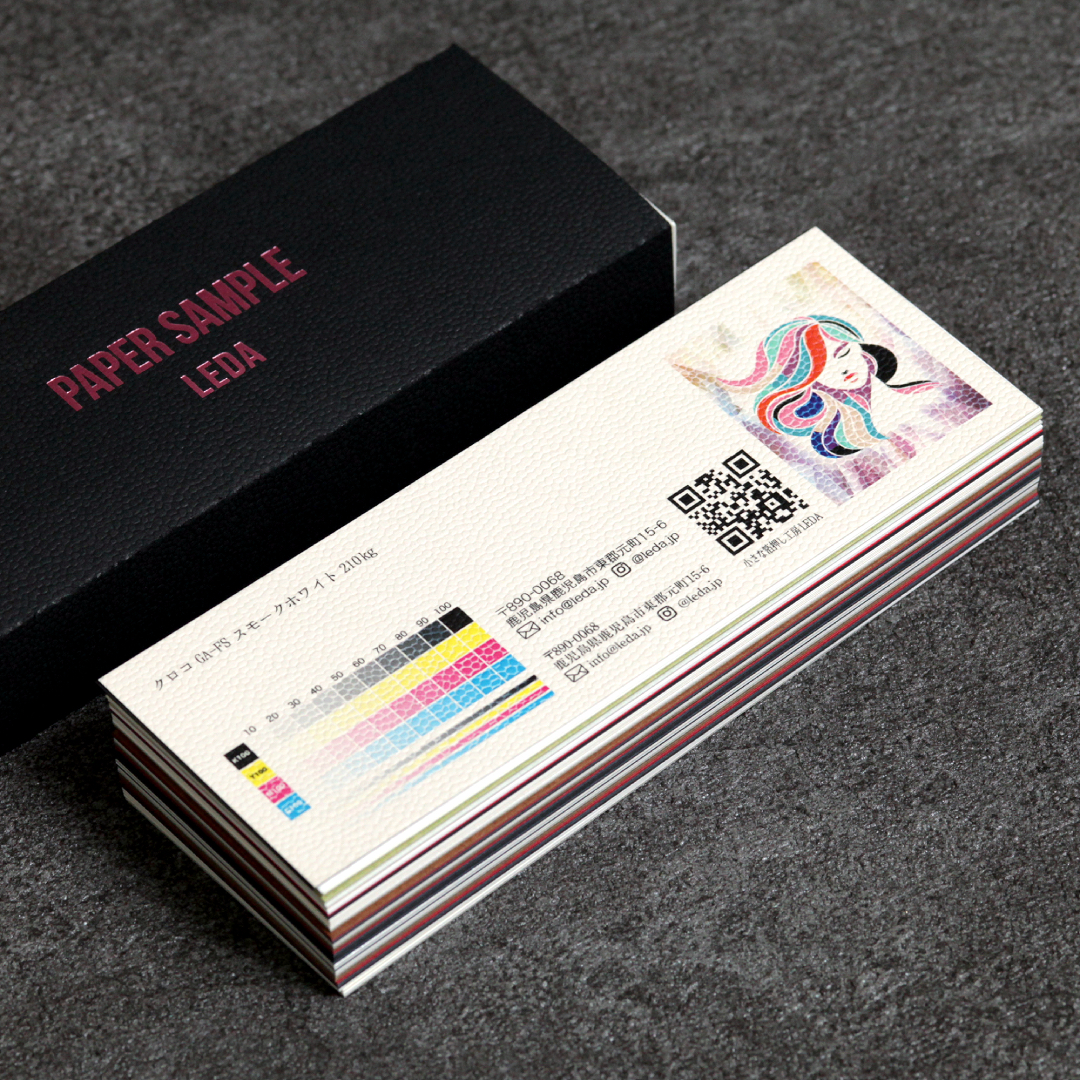 各サンプルはコンパクトなスリーブケースに収納してお届けします。保管や持ち運びがしやすく、クライアント様へのご提案用にも最適です。さらに、箔サンプル集と合わせてお求めいただければ割引料金(+1,000円)でご提供します。(下記オプションで追加してください)