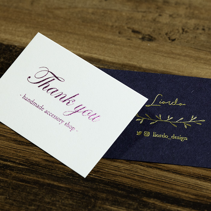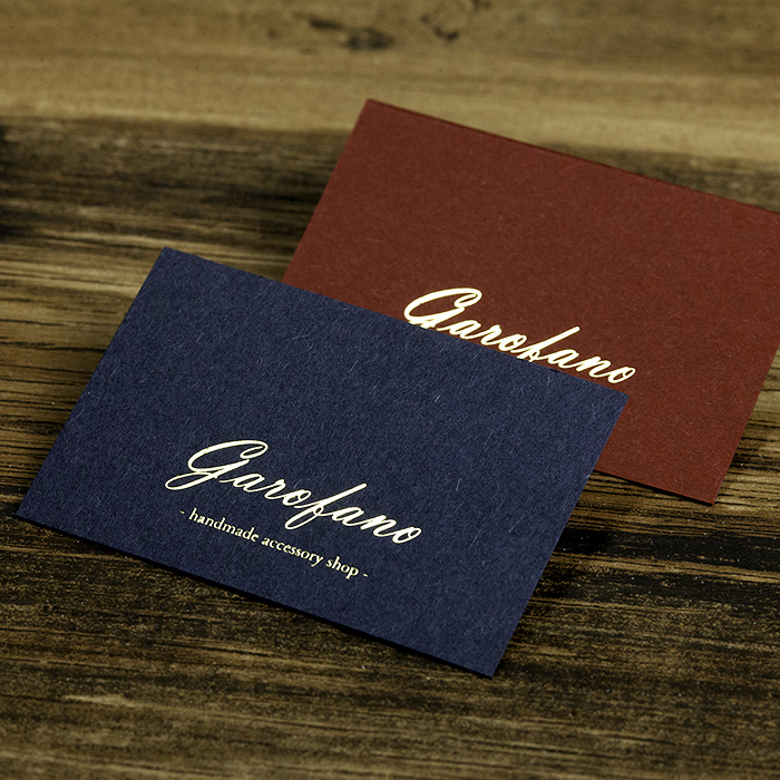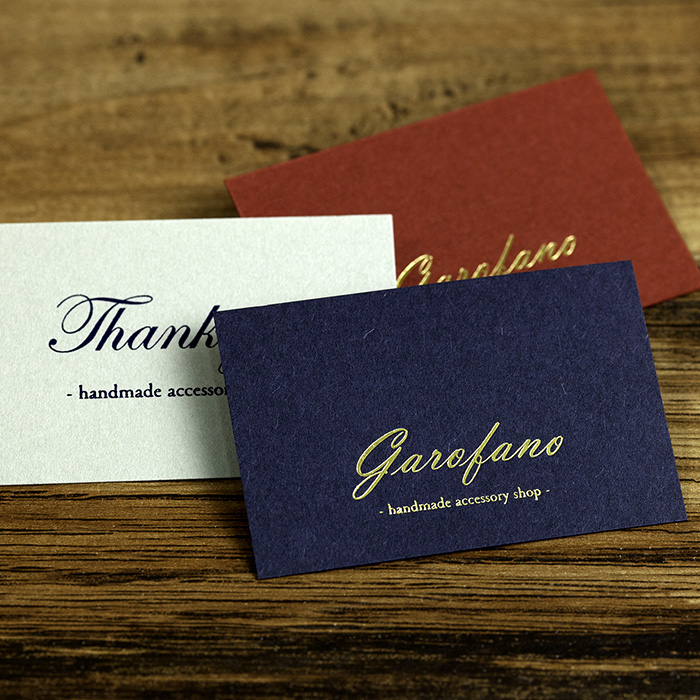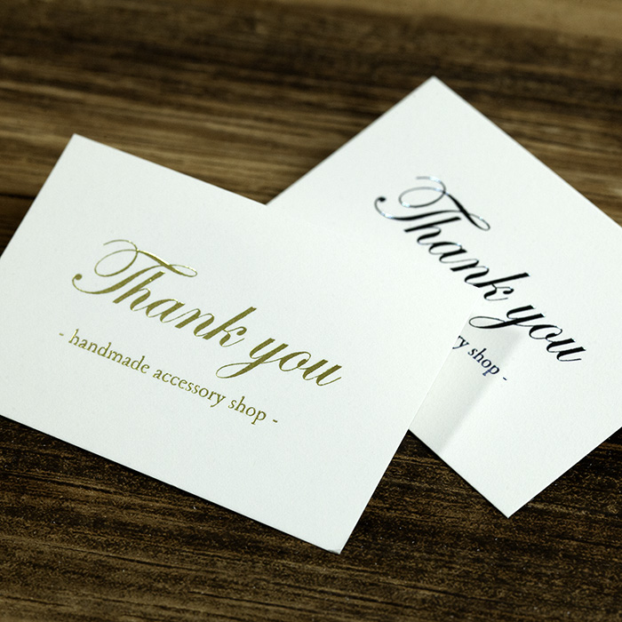 箔押しの範囲を「10平方cm以内」にすることで低価格を実現した箔押し印刷商品です。サイズは少し横長のミニサイズ。アクセサリー台紙やサンキューカードなどの作成にお勧めです。