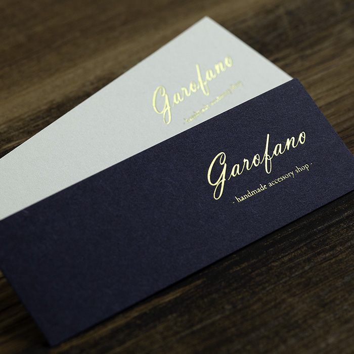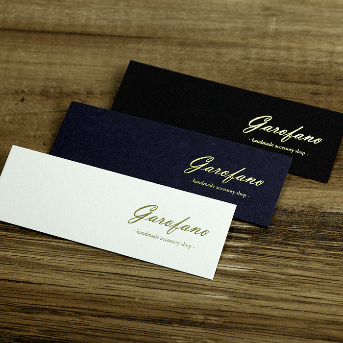 箔押しの範囲を「10平方cm以内」にすることで低価格を実現した箔押し印刷商品です。サイズは一般的な名刺の短辺を約半分にしたハーフサイズ。極厚紙のため高級感は抜群です。